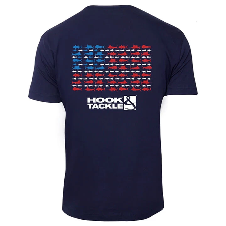 Hook & Tackle® Men’s American Fish T-Shirt features sailfish, marlin, tuna and bull dolphin within the American flag on the back of the shirt. This soft-touch Premium Cotton and Cotton blend fishing t-shirt offers a comfortable fit, feel and durability while retaining its shape and elasticity. The shirt also features a front chest print of the Hook & Tackle® logo.