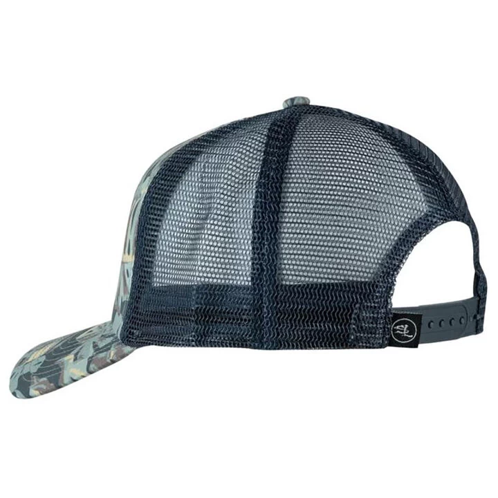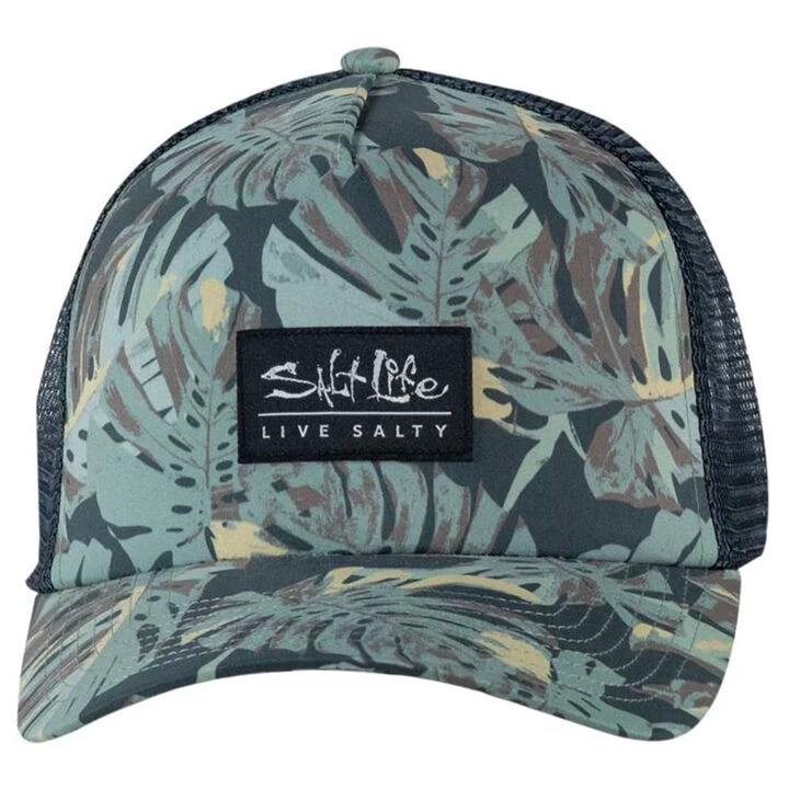 Salt Life® Men’s Lounging Trucker low profile hat is made from 100% Polyester with a front woven label, rear woven label, and mesh back. This Salt Life® hat features a foam front, plastic snapback closure, and a precurved bill.